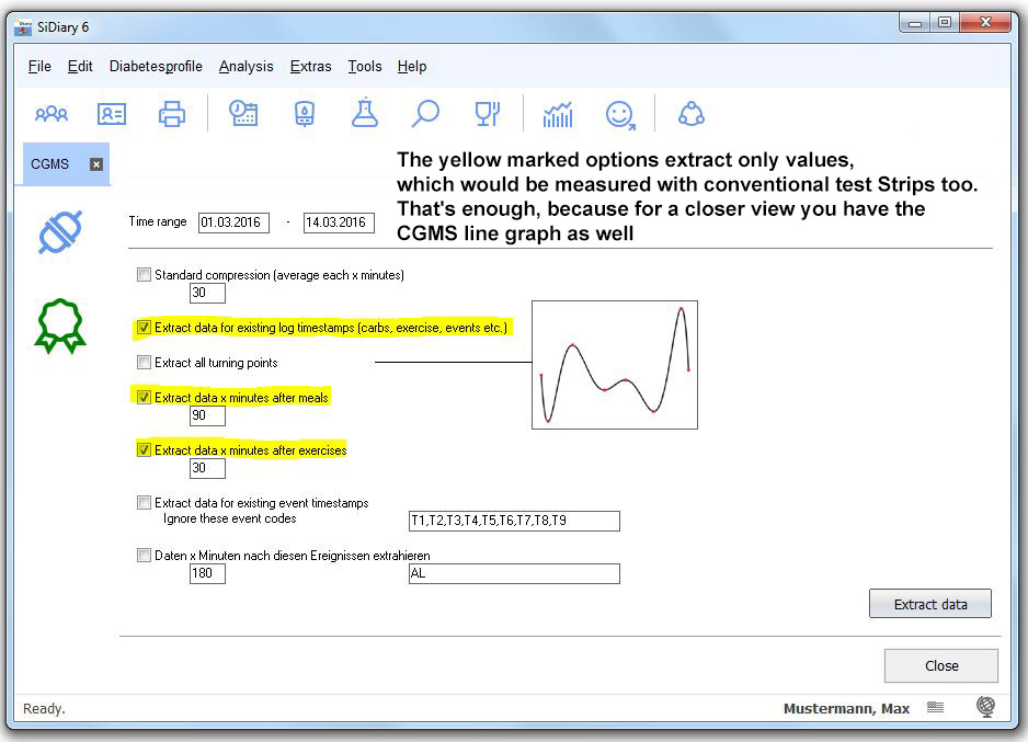 User of a CGMS (like Freestyle Navigator or Dexcom Seven Plus) has asked us if it could be possible to get single values from their CGMS datatype automatically written in their logbook. With this AddIn it's possible now. Install it like described above, then activate it in the menu 'Extras ->AddIns' and start it in the menu 'Edit ->CGMS'. Now you can select the time range, from which the values should be extracted and the criteria for the extracting procedure. Then click on 'Extract data' and you will find the values in your detail logbook.