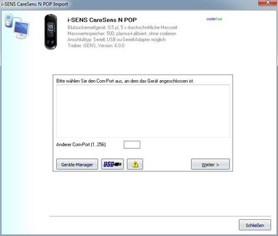 Für den Datenimport aus dem i-SENS CareSens N POP ist das Original-Kabel des Herstellers erforderlich.